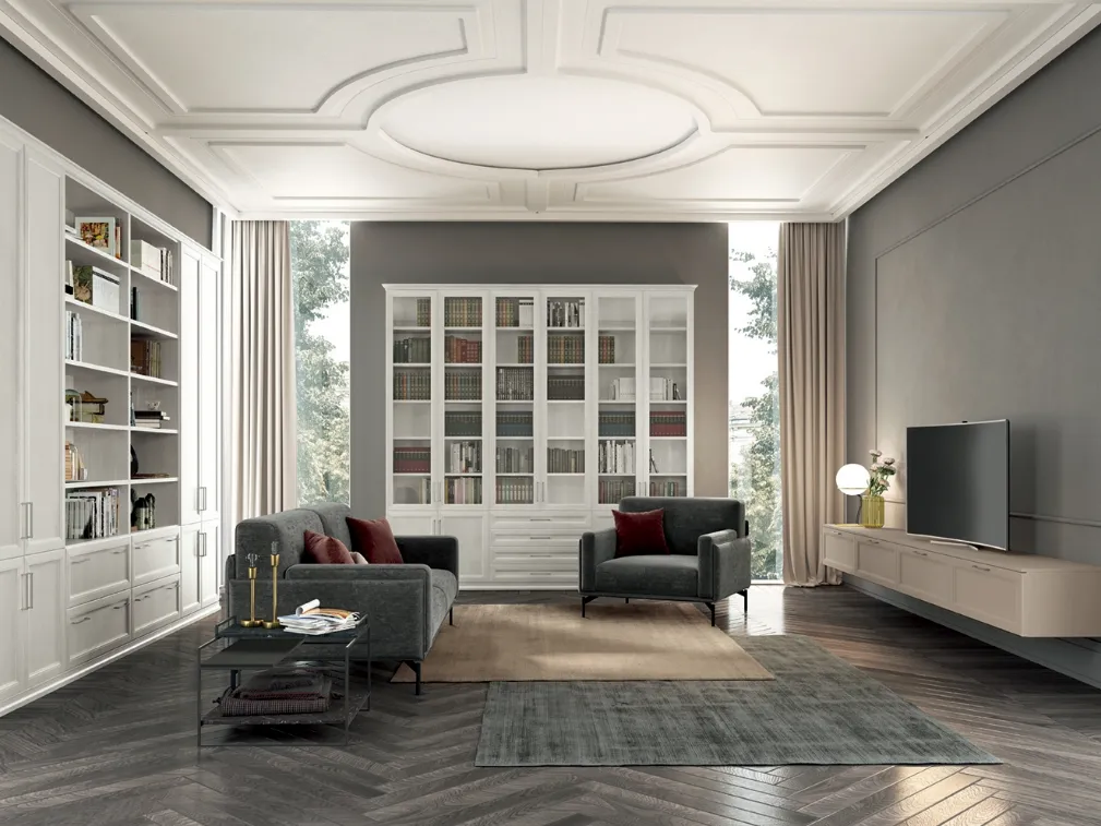 Finiture di pregio e forme decise: scopri la libreria Arcadia AS006 di Colombini Casa tra le più belle Librerie classiche a muro.